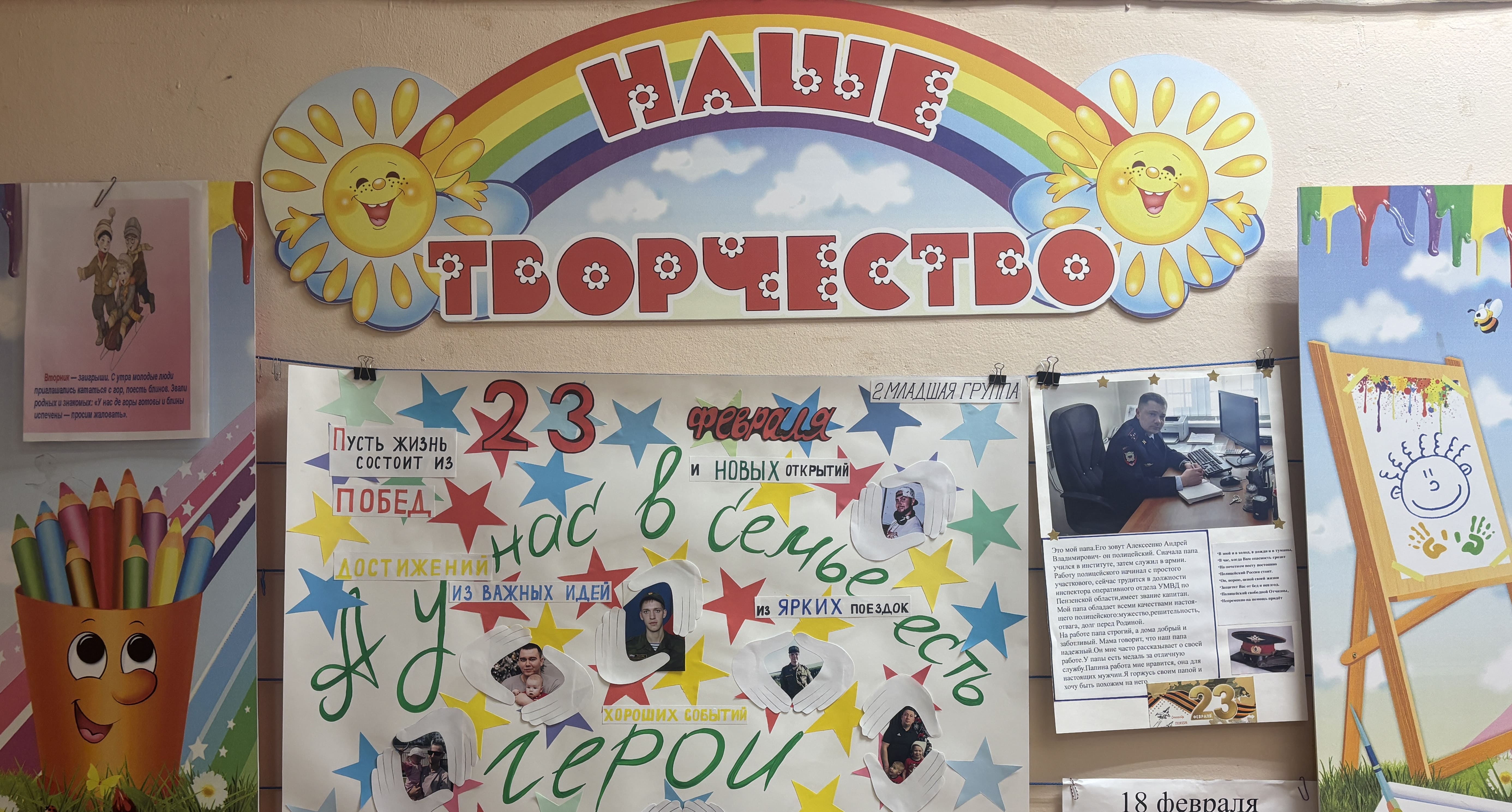 Защитники есть в каждой семье: дедушки, дяди, старшие братья и, конечно же, наши любимые папы. Мужчины по праву считаются защитниками нашей родины, нашего Отечества. Недаром даже слова «отец и Отечество» начинаются одинаково: они близки друг другу по смыслу. Отечество – это наша страна, Родина. Это так же день памяти всех тех, кто не щадил себя ради Отечества, кто до конца оставался верен воинскому долгу. Во все времена Россия славила своих героев — воинов, отстоявших независимость, честь и достоинство Родины. Праздник «23 февраля — День Защитника Отечества» в детском саду – хороший повод для воспитания у дошкольников чувства сопричастности к лучшим традициям своей Родины, формирования у детей гордости за славных защитников Отечества, стоящих на страже мира и покоя в России. В предверии этого праздника в нашем детском саду дошкольники и их родители поделились своими Героями.
